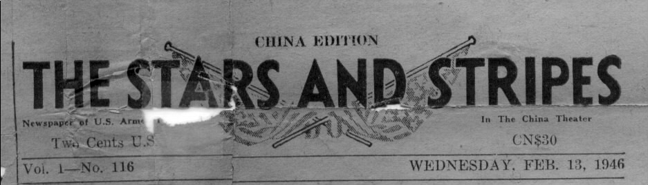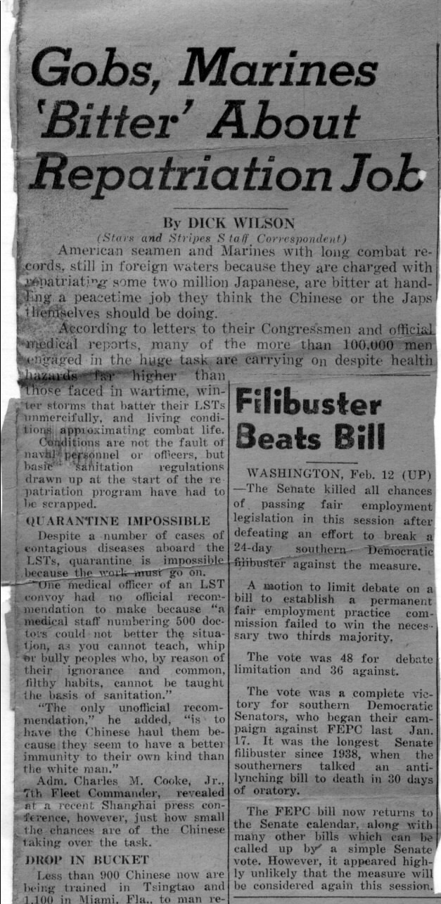 This clipping from the Feb. 13, 1946 "Stars and Stripes - China Edition" was enclosed with a letter written by Robert Grobbel, Cox, USN to his parents from Sasebo, Japan on Feb. 19, 1946. He was stationed on the USS LST-847, which had arrived the day before from Tsingtao, China carrying 1,190 Japanese civilians.