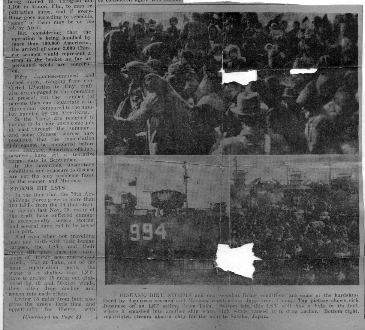 Newspaper Article about the 78th Amphibious Force's Repatriation of Japanese Civilians from China to Japan During the Winter of 1945-46